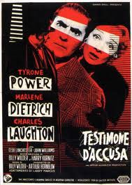 Dal racconto omonimo (e poi pièce teatrale di successo) di Agatha Christie, uno dei grandi classici del cinema americano tribunalizio. Come non di rado avviene in un film di Billy Wilder, c’è tutto e tutto è al posto giusto: ritmo serrato, colpi di scena, questione morale, sense of humour, l’innata dote di esaltare la drammaticità della storia e dei personaggi comprimendola in pochi spazi angusti (flashback a parte, tutto si svolge in due luoghi: casa di Robarts e tribunale) ed en passant grandi interpretazioni (sontuosi Laughton e Marlene Dietrich). Diventa inutile e noioso solamente recensire film come questo, perché proprio non c’è niente che non vada. Ultimo film di Tyrone Power, due anni prima di morire d’infarto sul set di “Salomone e la regina di Saba”.