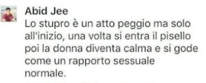 Abid Jee, 24 anni, impiegato come mediatore culturale presso la cooperativa bolognese Lai-Momo si esprime con un commento sullo stupro di Rimini che, volenti o nolenti, buonismo a parte, accoglienza doverosa a parte, difficoltà di integrazione a parte, la dice così lunga sul reale pensiero di troppi fra i nostri ospiti che basterebbe questo per rivedere la politica di accoglienza italiana. Jee ebbe a dire : “Lo stupro è peggio all’inizio, poi la donna si calma”.